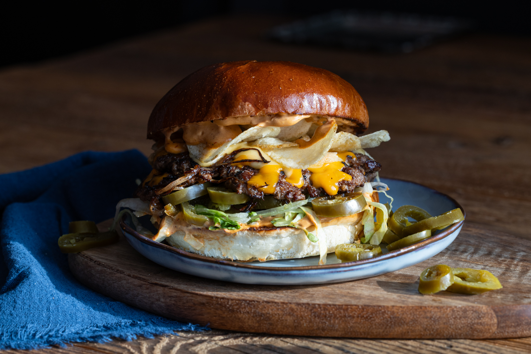 wołowina 2 x 100g, ser Cheddar Amerykański, marynowana papryczka jalapeno, świeże jalapeno, grillowana biała cebula, chipsy ziemniaczane, sałata, sos mayo chipotle adobo, bułka maślana