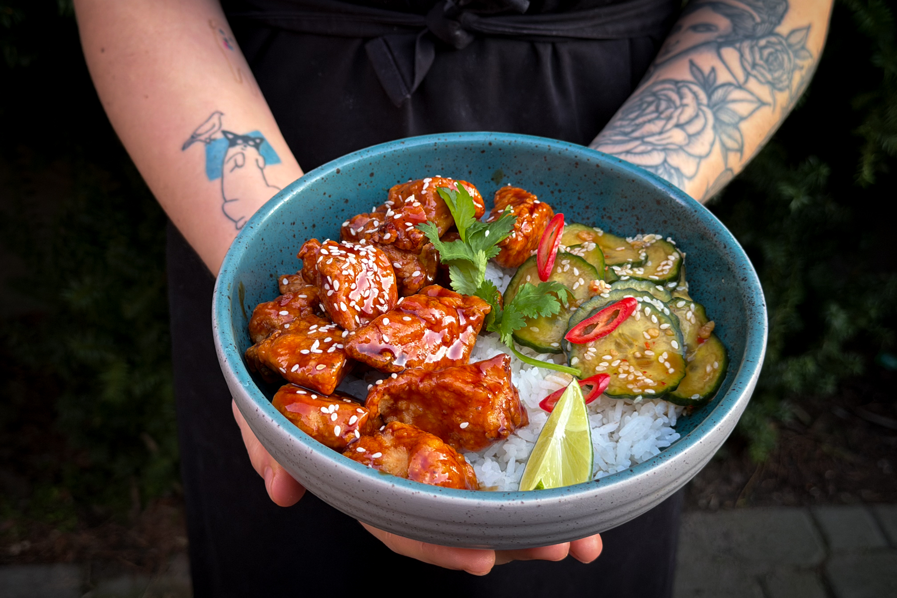 filet z kurczaka w sosie Teriyaki, ryż jaśminowy, ogórek w azjatyckim dressingu, papryczka chili, limonka, sezam