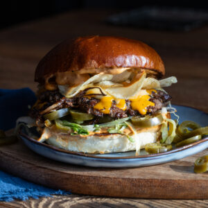 wołowina 150g, ser pleśniowy, sałata lodowa, czerwona cebula, grillowany pomidor, rukola, prażone pestki słonecznika, ogórek, mayo chipotle, sos francuski